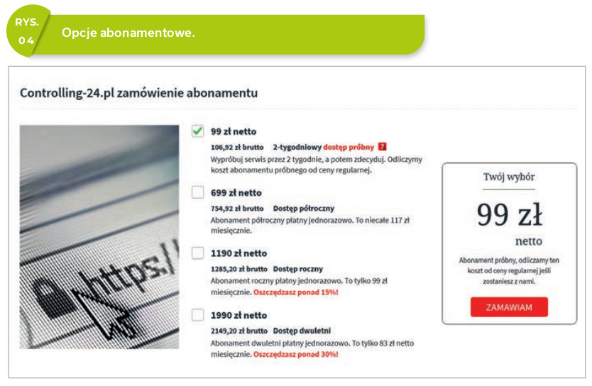 Wydawca, odpowiadając za sygnały z rynku, wraz z nową odsłoną serwisu, zdecydował się wprowadzić nową opcję cenowo-abonamentową dla niezdecydowanych, którą jest abonament próbny, czyli niezobowiązująca możliwość testowania serwisu przez dwa tygodnie (Rys. o4). Ciekawostką jest to, że przy przejściu na dowolny, „pełny” plan abonamentowy, cena zapłacona za okres próbny jest odliczana od ceny regularnej. Co więcej, dostęp próbny gwarantuje wszystkie dostępne na portalu funkcjonalności.