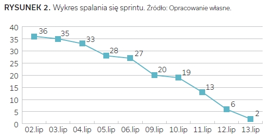 Rysunek 2 obrazuje przykładowe „spalanie” się dwutygodniowego sprintu, w którym prace wyceniono na 36 punktów. 5 lipca udało się zakończyć zadania, które wyceniono na 8 punktów, a zatem do wypracowania pozostało jeszcze 28 punktów. 12 lipca wypracowano już 30 punktów, więc do zrealizowania zostały zadania o wartości 6 punktów.