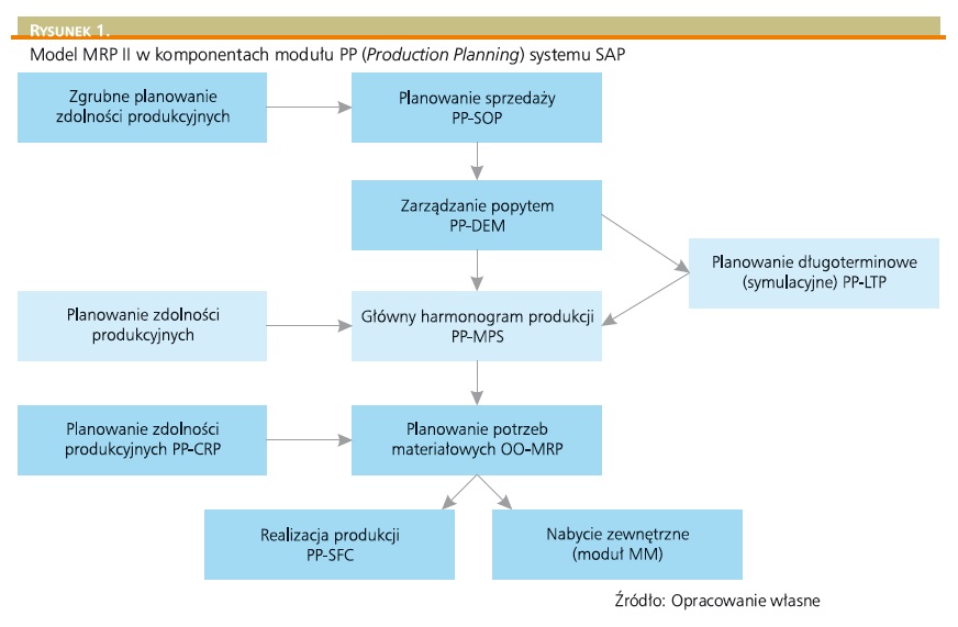 Zintegrowane systemy informatyczne, jak SAP ERP, pozwalają całościowo odwzorować i zamodelować procesy biznesowe firmy produkcyjnej. Nie są izolowane od pozostałych obszarów działalności firmy, a zatem integracja ma tu kluczowe znaczenie. Rozwiązania SAP w obszarze planowania produkcji są w pełni zgodne z modelem MRP II. System planowania w SAP jest oparty na konstrukcji warstwowej procesów biznesowych, która obejmuje kolejne poziomy planowania, pozwalające na przejście od planowania długoterminowego dla grup asortymentowych do bardzo szczegółowego harmonogramowania poszczególnych linii produkcyjnych. Model ten jest sprawdzony w wielu branżach i stanowi standard zaawansowanych systemów informatycznych w zakresie zarządzania procesami produkcyjnymi.