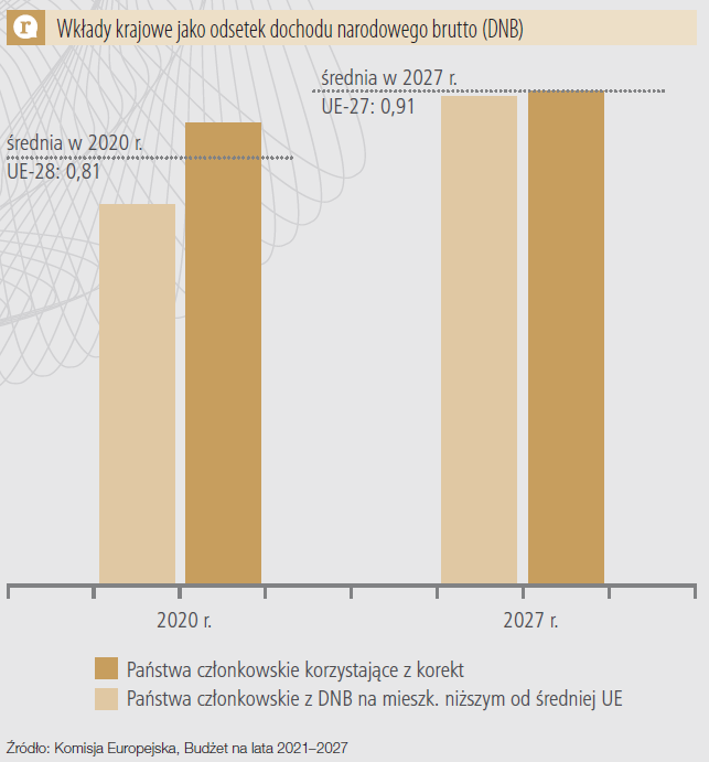 Propozycja Komisji Europejskiej obejmuje długoterminowy budżet na poziomie 1,114% dochodu narodowego brutto 27 państw UE (bez Wielkiej Brytanii, która 31 stycznia 2020 r. wystąpiła z Unii Europejskiej). Negocjowany budżet jest niższy od obecnego, który wynosi 1,16% DNB. Wykres przedstawia wkłady krajowe z podziałem na koncepcję wydatkowania środków z budżetu UE na lata 2021–2027.