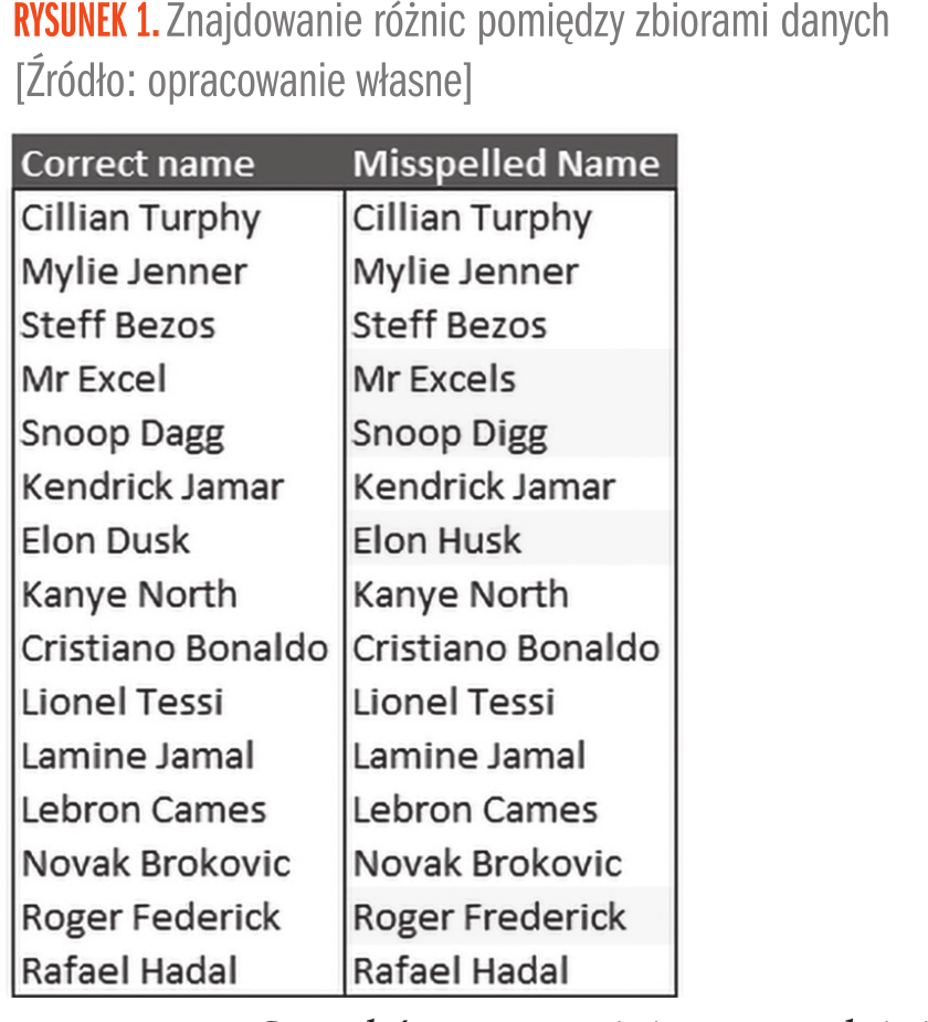 Spójrzmy na zestaw danych na Rysunku 1. Prezentuje on dwie kolumny. Wyobraźmy sobie, że zamiast kilkunastu wierszy mamy 500 wierszy, z czego wiemy, że pewna część danych w drugiej kolumnie jest niepoprawna. To mogą być różne typy danych i sytuacje. Chcemy jak najszybciej znaleźć różnice. Jak najłatwiej to zrobić? Wykonaj następujące kroki: