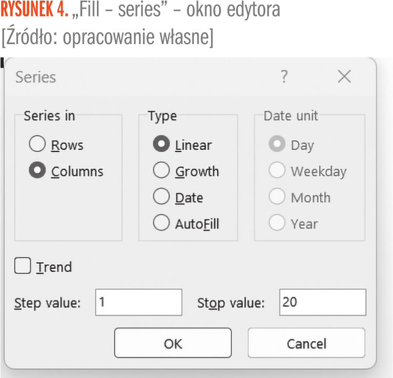 - Wybieramy „Series in = Columns”, step value 1, stop value 20, klikamy OK.