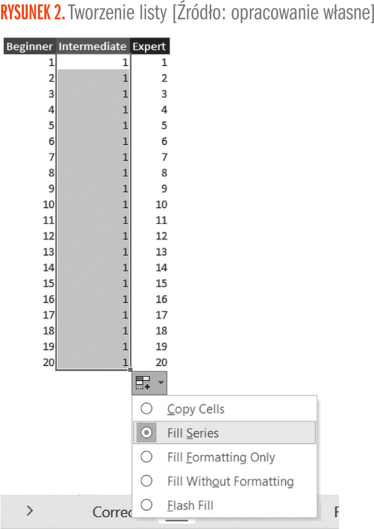 Pierwszy trik na rozgrzewkę mamy za sobą. Teraz sprawdźmy, w jaki sposób możemy tworzyć listę numeryczną. Sposobów mamy minimum 3, zależnie od poziomu zaawansowania użytkowania. Spójrzmy, jak może sobie z tym poradzić osoba początkująca. Wpiszmy odpowiednio „1” i „2” w pierwszych dwóch wierszach, a następnie przeciągamy listę w dół do nr 20. To pierwszy sposób. Osoba średniozaawansowana najprawdopodobniej wykona inne, następujące kroki: