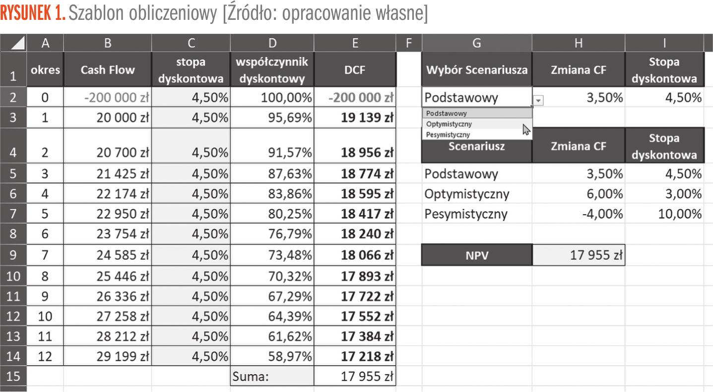 W naszym przykładzie wykorzystamy szablon obliczeniowy (Rysunek 1), który zawiera rozpisane wszystkie interesujące nas wartości i obliczenia, a także pozwala w prosty sposób wybrać, czy chcemy rozważać podstawowy, optymistyczny czy pesymistyczny scenariusz inwestycji.