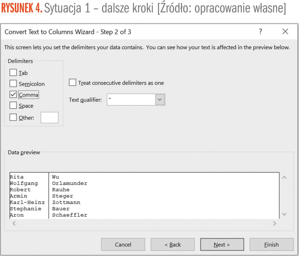 W kolejnym kroku wybieramy delimiter, czyli to, w jaki sposób nasze dane należy rozdzielić. W tym wypadku jest to przecinek, dlatego zaznaczamy „Comma”. W sekcji data preview po kliknięciu opcji „comma” zauważymy, że Excel pokaże nam, w jaki sposób zamierza podzielić dane na bazie wskazanej opcji. Output jest zgodny z oczekiwaniami, dlatego nic więcej nie zaznaczamy i klikamy Next, przechodząc do ostatniego kroku.