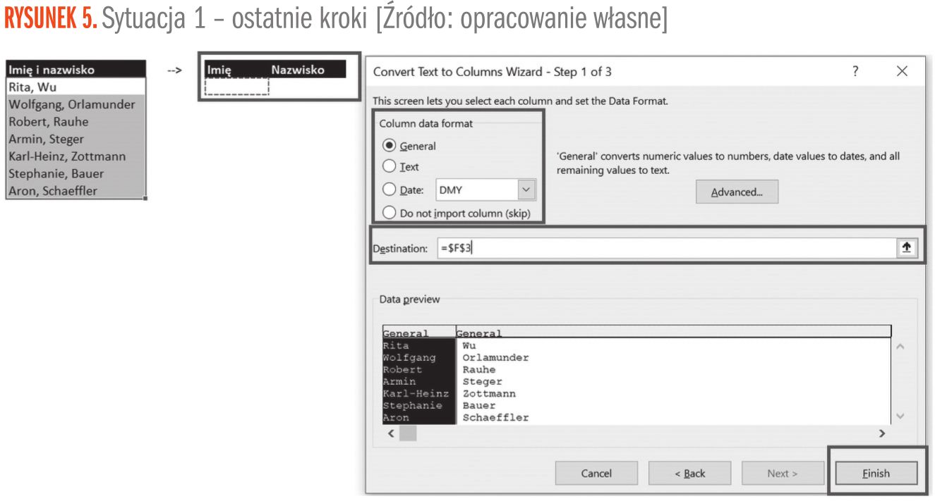W ostatniej sekcji wybieramy format danych, jaki mają mieć nasze kolumny. W tym wypadku możemy pozostawić opcję general, aczkolwiek opcja text również byłaby prawidłowa. Musimy wybrać także miejsce, gdzie zostaną wstawione dane. Docelowo Excel proponuje nam komórkę B3, czyli pierwszą komórkę zaznaczonego zestawu danych. Tak to wygląda zawsze, ponieważ domyślnie Excel chce dzielić dane, poczynając od kolumny z zaznaczonym zestawem danych. My jednak wybieramy F3, by dane zostały wklejone do przygotowanych kolumn. Ostatni krok to przycisk „Finish”. Otrzymujemy dane w oczekiwanej formie (Rysunek 5).