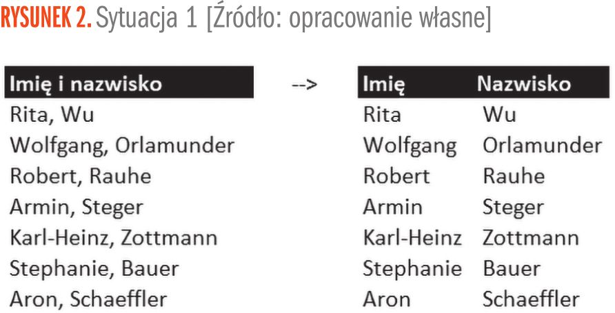 Przejdźmy do meritum i przykładów. W pierwszej sytuacji chcemy podzielić kolumnę imię i nazwisko na dwie kolumny, z pominięciem przecinka. Poniższy rysunek pokazuje dane przed podziałem i po nim.