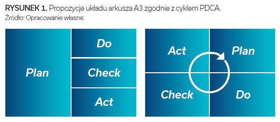 Raport A3 to nieskomplikowane narzędzie, lecz nie dajmy się zwieść jego prostocie. Dzięki temu, że jest łatwe w konfiguracji i stoi za nim cała metodologia Lean Management, do jego budowy można zaprząc profesjonalne i precyzyjne rozwiązania służące planowaniu, kontroli i analizie. Raport A3 to bardzo metodyczny sposób działania, w którego sercu leży filozofia ciągłego doskonalenia i cykl PDCA – esencja kaizen. Cykl PDCA składa się z czterech etapów (Plan – Do – Check – Act) i myślenie zgodnie z nim zapewnia trwałe rozwiązywanie problemów poprzez dogłębną analizę, kontrolowane wdrożenie rozwiązania, a następnie jego standaryzację. Dlatego też układ prawidłowo skonstruowanego raportu powinien korespondować z czterema krokami PDCA. Jednak struktura tych kroków zależy już od charakteru organizacji i sposobu rozwiązywania w niej problemów czy charakteru pracy zespołu projektowego. Na Rysunku 1 przedstawiono dwa przykładowe układy raportu A3. Wersja A może być stosowana do projektów o długiej fazie planowania i zbierania dużej ilości danych, po czym następuje szybka faza realizacji. Wersja B z kolei zalecana jest dla problemów już znanych w organizacji, których rozwiązania nie są skomplikowane i można je dość szybko opracować.