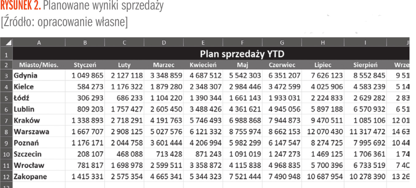Dane z faktycznej sprzedaży znajdują się w tabeli tSprzedaż, natomiast planowane wyniki sprzedażowe znajdują się w standardowym zakresie komórek. Jednym z powodów, dla którego sprzedaż faktyczna znajduje się w tabeli Excela, jest to, że są to dane sprzedażowe z kilku lat. Układ danych w tabeli Excela ułatwia też m.in. analizę danych i odwoływanie się do nich z innego arkusza.