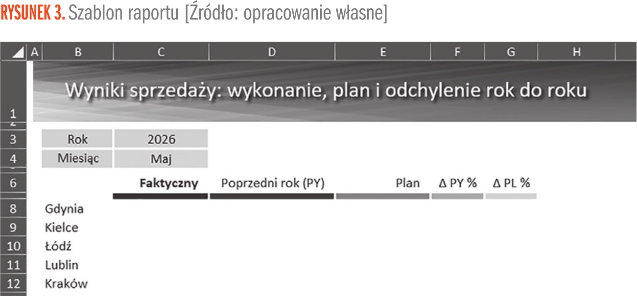 Na podstawie zgromadzonych danych będziemy chcieli stworzyć prosty raport porównawczy, w którym będziemy mogli wybierać miesiąc, który chcemy analizować oraz chcemy, żeby rok automatycznie był ustawiany na aktualny. Wstępny szablon raport pokazuje Rysunek 3.