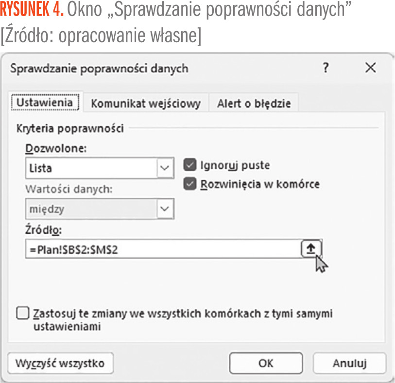 W następnym kroku dodamy listę rozwijaną w komórce C4 (Rysunek 3). Żeby podkreślić, że jest ona wyjątkowa, został jej ustawiony inny kolor wypełnienia od sąsiadujących komórek. Gdy zaznaczymy interesującą nas komórkę, na karcie Dane klikamy w polecenie „Poprawność danych”. Otworzy to okno „Sprawdzanie poprawności danych”, gdzie na zakładce Ustawienia w polu „Dozwolone” wybieramy opcję „Lista” (Rysunek 4). Następnie możemy wstawić w pole „Źródło” zakres komórek, w którym znajduje się lista miesięcy. My taką listę mamy na arkuszu Plan (Rysunek 2) w nagłówkach kolumn. Wystarczy, że po kliknięciu w pole „Źródło” zaznaczymy myszką odpowiedni zakres. Excel wstawi zakres zaznaczonych komórek (=Plan!$B$2:$M$2), a nam pozostaje jedynie zatwierdzenie utworzenia listy rozwijanej przez kliknięcie przycisku OK.