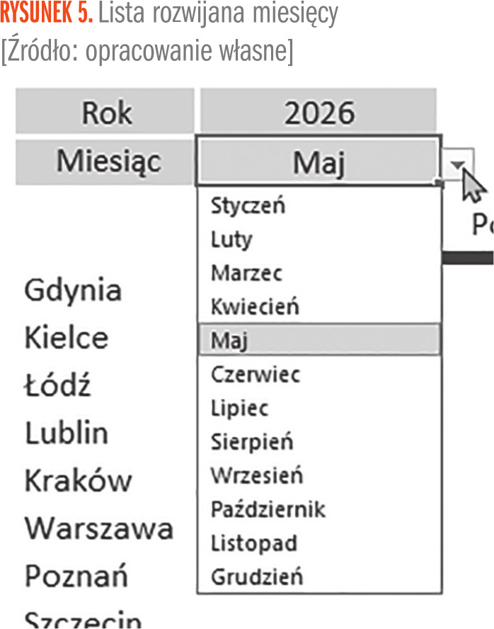 Dzięki temu, po zaznaczeniu komórki C4, obok niej pojawi się ikona rozwijanej listy, za pomocą której możemy wybrać dowolny miesiąc z wskazanego zakresu (Rysunek 5).