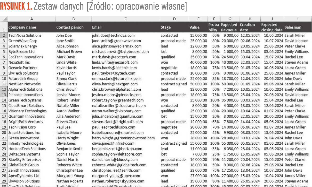 Tym razem popracujemy na zestawie danych pokazującym pipeline sprzedażowy z podziałem na fazy, oczekiwany przychód i sprzedawcę obsługującego daną firmę. W tabeli (Rysunek 1) znajduje się mnóstwo ciekawych danych wartych podsumowania.