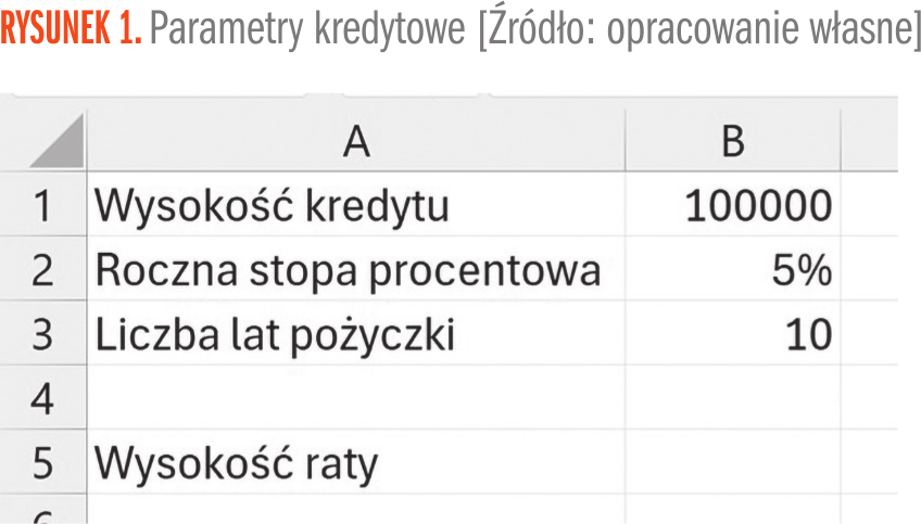 Dodatkowo przyjmijmy miesięczne spłaty kredytu. Chcąc teraz wyliczyć wysokość raty kredytowej, musimy w komórce B5 wpisać następującą formułę: