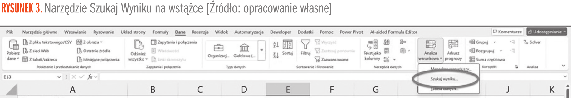 Teraz jednak może pojawić się następujące pytanie: w jakiej wysokości kredyt mogę wziąć, aby przy takich samych parametrach jak poprzednio miesięczna rata wynosiła 1500 zł? Aby na to pytanie odpowiedzieć, są dwie możliwości. Pierwsza to ręczne wprowadzanie różnych wartości dla wysokości kredytu do komórki B1 i sprawdzanie, kiedy wysokość raty wyniesie 1500 zł. Jednak to rozwiązanie jest bardzo nieefektywne. Może się okazać, że trzeba będzie poświęcić bardzo dużo czasu, aby znaleźć odpowiednią wartość. Drugi sposób to wykorzystanie narzędzia „Szukaj wyniku” dostępnego w Excelu. Narzędzie to znajdziemy na wstążce na karcie „Dane” i po wybraniu narzędzia „Analiza warunkowa” (zostało to pokazane na Rysunku 3).