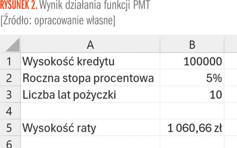 Warto w tym miejscu zauważyć, że wartość bieżąca pożyczki jest podawana ze znakiem minus, tak traktuje ją funkcja PMT(). Jeśli tego nie uwzględnimy, wtedy wysokość raty wyjdzie nam ujemna.