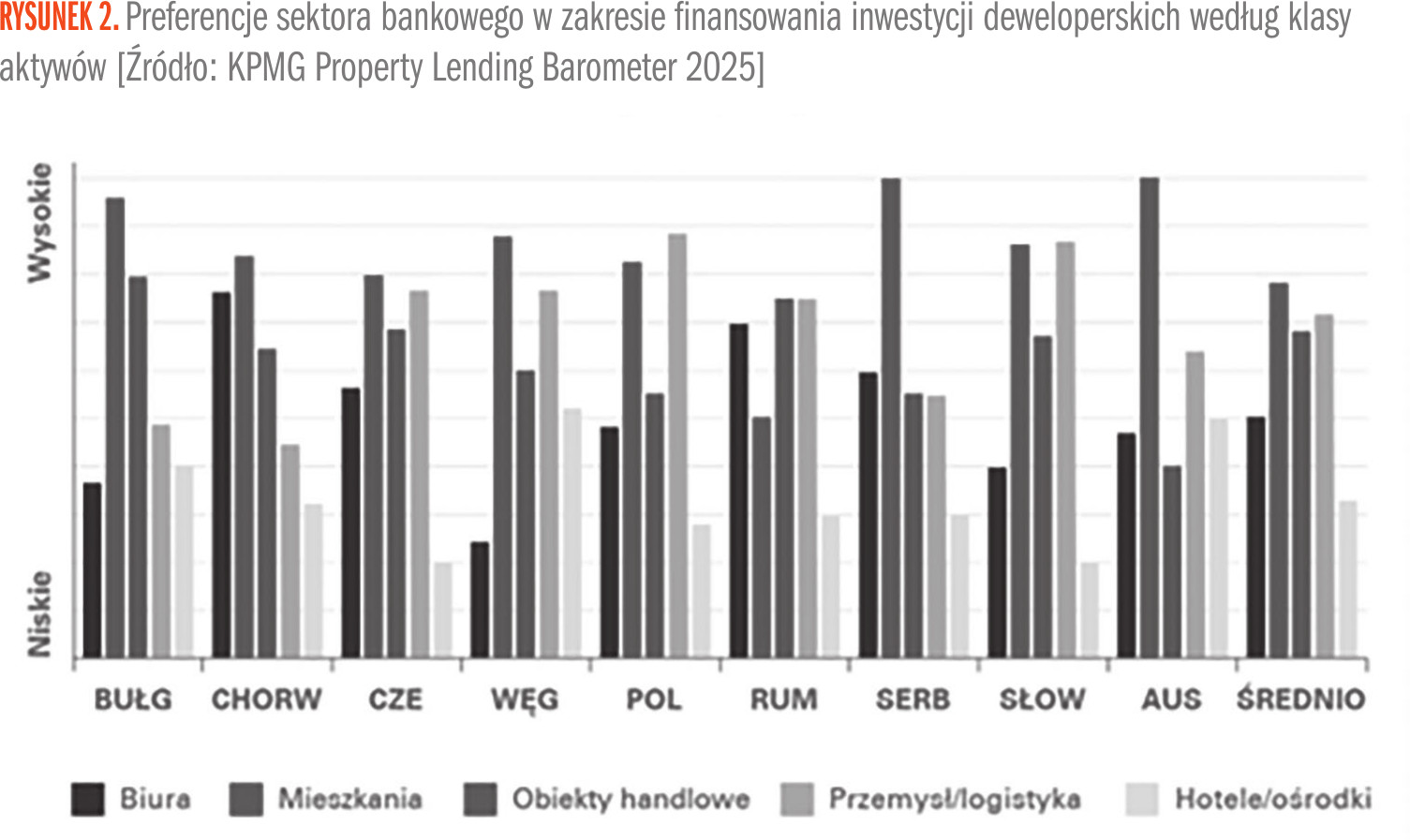 W 2025 r. najbardziej preferowanym sektorem dla finansowania nowych projektów w regionie Europy Środkowo-Wschodniej stało się budownictwo mieszkaniowe, co odzwierciedla utrzymujący się popyt i relatywnie wysoką płynność tego rynku. Projekty przemysłowe i logistyczne pozostają wysoko oceniane, natomiast hotele i obiekty typu resort wciąż są postrzegane jako najbardziej ryzykowne (Rysunek 2).