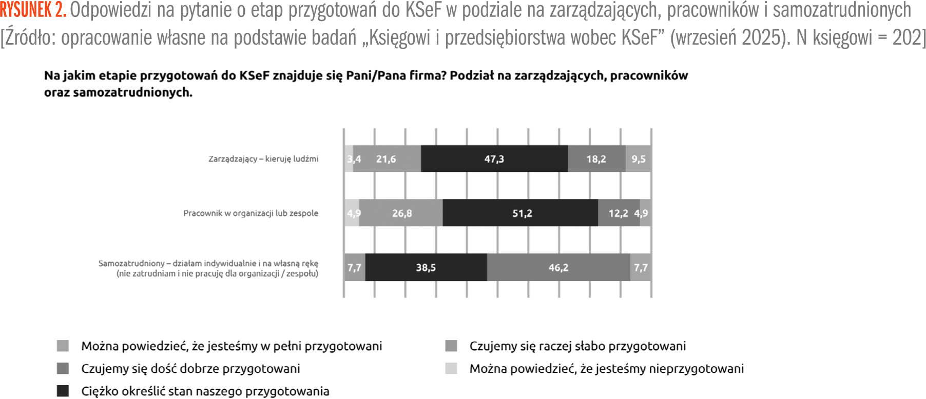 Największą niepewność czują natomiast księgowi o statusie pracowników w organizacjach – ponad połowa z nich ma wątpliwości odnośnie do swojego stanu przygotowania, a aż 1/3 czuje się słabo przygotowana lub nawet w ogóle.