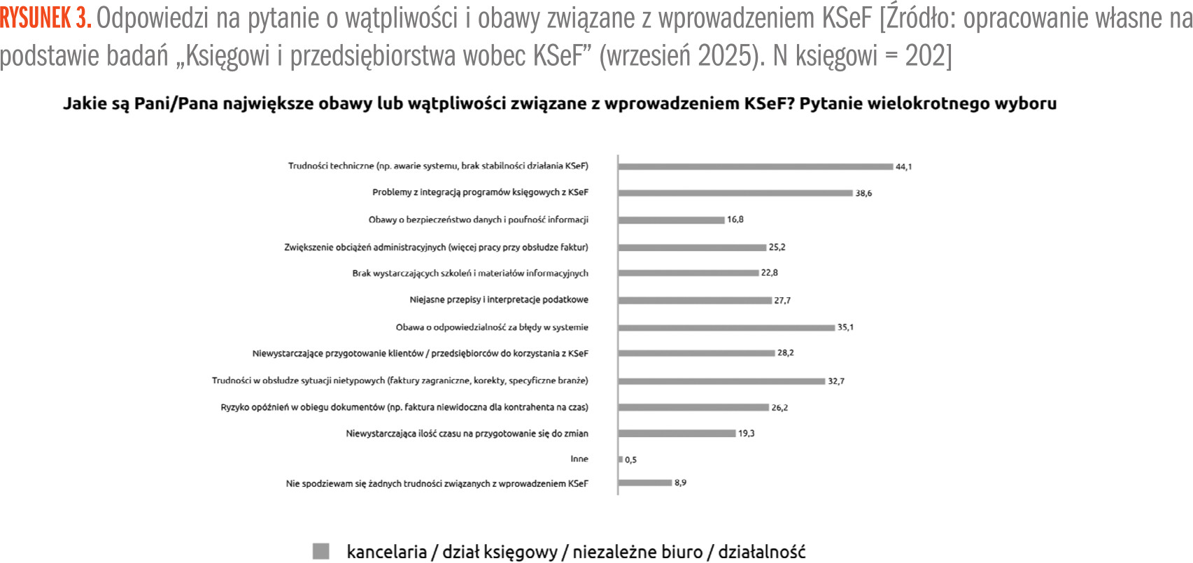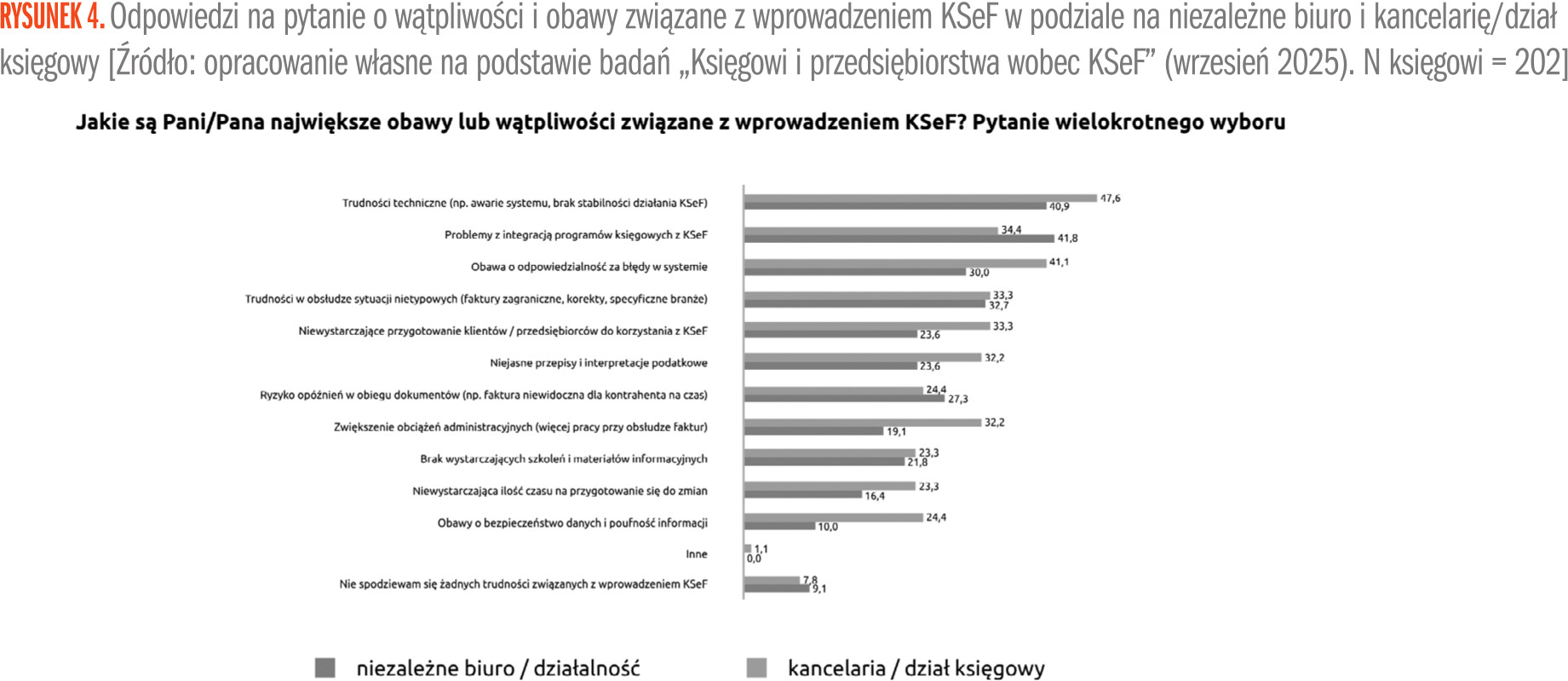 - trudności techniczne, np. awarie systemu, brak stabilności działania KSeF – 44%,