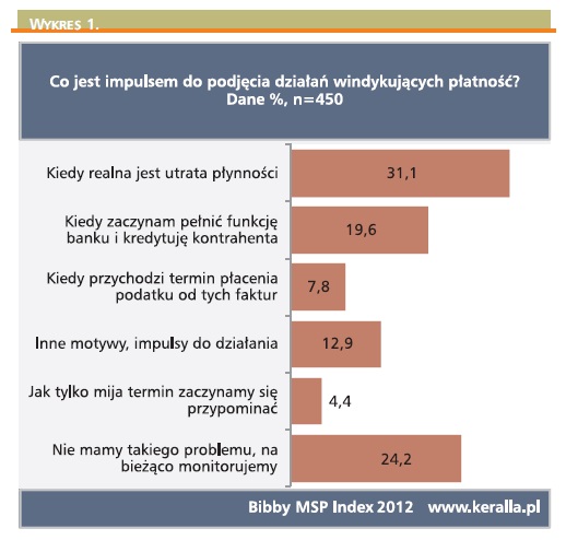 Brak zapłaty od głównego kontrahenta może jednak w końcu odciąć główny dopływ środków finansujących firmę. Rozmawiając z przedsiębiorcami, widzimy, że zupełnie inaczej patrzą oni na problem przeterminowanych należności, gdy uświadamiają sobie, że w praktyce bezpłatnie kredytują swojego odbiorcę. 20% badanych przez nas firm przyznało, że zaczyna poważnie upominać się o należne im pieniądze właśnie w chwili, gdy dochodzi do nich, iż stają się de facto bankiem udzielającym wydłużającego się w nieskończoność kredytu kupieckiego. Staje się to tym dotkliwsze, gdy nadchodzą terminy płacenia podatków. To właśnie konieczność wypłaty większych sum na obowiązkowe płatności jest momentem, gdy przedsiębiorcy najboleśniej odczuwają brak płynności.