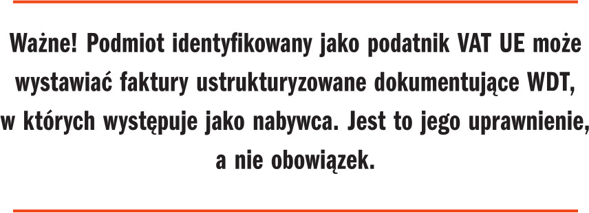 O tym, czy faktura powinna być wystawiona w KSeF, decyduje status sprzedawcy. Oznacza to, że taki obowiązek istnieje również, gdy sprzedawca jest polskim podatnikiem z numerem NIP, a nabywcą – podmiot zagraniczny, który dokonuje samofakturowania. Tak jednak nie będzie. Ustawodawca zwolni z tego obowiązku podmioty zagraniczne, które nie mają polskiego NIP. Będą mogły dokonywać samofakturowania poza KSeF. Wyjątek dotyczy nabywców z krajów UE, zidentyfikowanych jako podatnicy VAT UE. Polski podatnik może im nadać w KSeF uprawnienie do samofakturowania WDT.