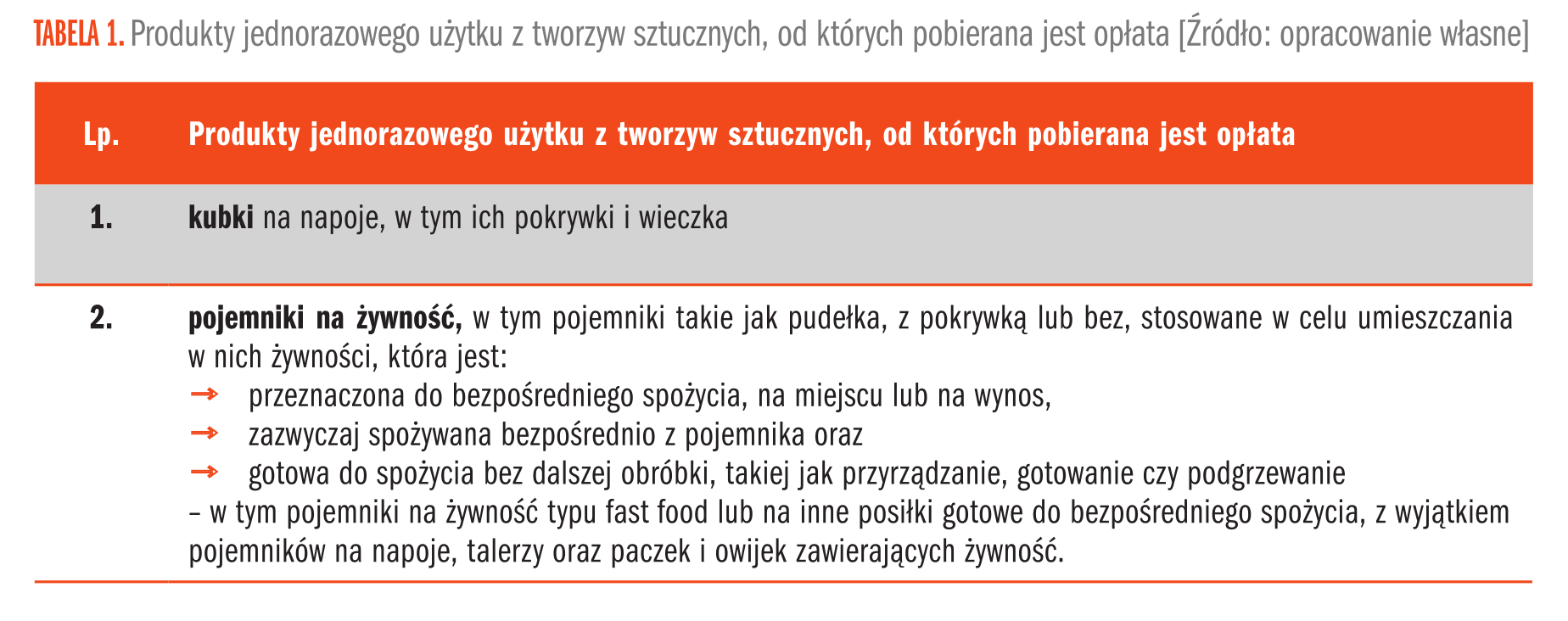 Na podstawie art. 3b ust. 1 ustawy z 11 maja 2001 r. o obowiązkach przedsiębiorców w zakresie gospodarowania niektórymi odpadami oraz o opłacie produktowej (dalej jako ustawa) od 1 stycznia 2024 r. przedsiębiorcy prowadzący jednostki handlu detalicznego, hurtowego oraz jednostki gastronomiczne, w których są oferowane określone przepisami produkty jednorazowego użytku z tworzyw sztucznych (zob. tabelę), będące opakowaniami, lub napoje lub żywność pakowane przez tego przedsiębiorcę w te produkty, obowiązani są do pobierania opłaty od użytkownika końcowego nabywającego te produkty lub napoje lub żywność w tych produktach. Obowiązek ten obciąża również przedsiębiorców pakujących i oferujących – za pomocą urządzenia vendingowego, w tym umieszczonego także w miejscach innych niż jednostki handlu detalicznego, jednostki handlu hurtowego lub jednostki gastronomiczne – napoje lub żywność w produktach jednorazowego użytku z tworzyw sztucznych (zob. art. 3b ust. 2 ustawy).