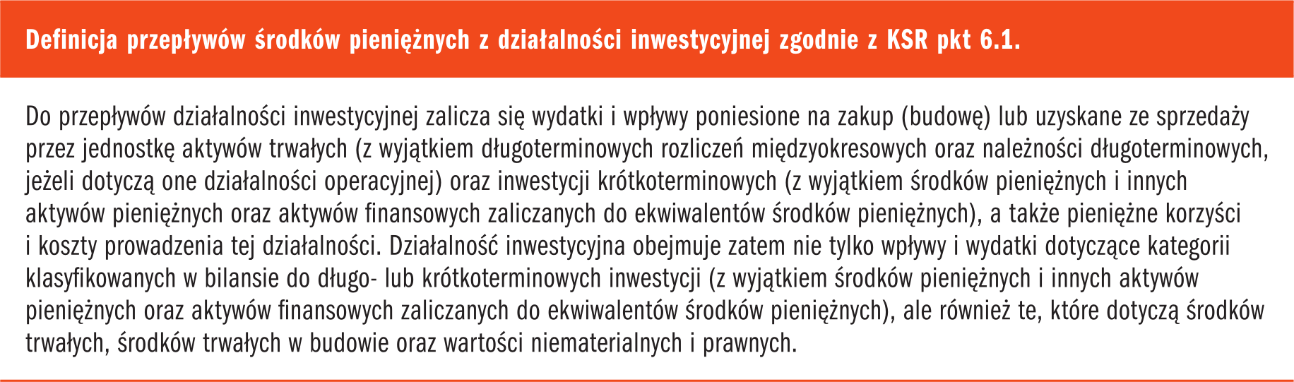 Zgodnie z pkt 6.3 KSR do przepływów działalności inwestycyjnej zalicza się w szczególności następujące rodzaje wydatków i wpływów: