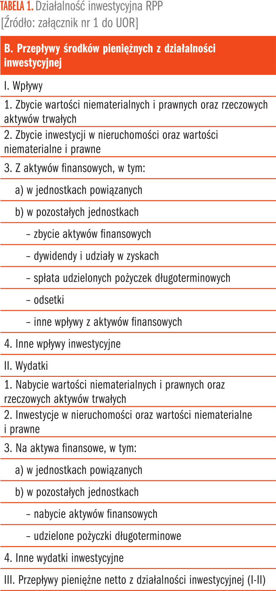 Druga część rachunku przepływów pieniężnych (RPP) to grupa B, czyli „Przepływy środków pieniężnych z działalności inwestycyjnej”. Obejmuje ona przede wszystkim przepływy związane z nabyciem i zbyciem środków trwałych, wartości niematerialnych i prawnych, środków trwałych w budowie, a także inwestycji długo- i krótkoterminowych, za wyjątkiem inwestycji krótkoterminowych kwalifikowanych do pozycji bilansu B III 1c) środki pieniężne i inne aktywa pieniężne1. Wzór rachunku przepływów pieniężnych zawiera załącznik nr 1 do ustawy o rachunkowości (dalej UOR) – Zakres informacji wykazywanych w sprawozdaniu finansowym, o którym mowa w art. 45 ustawy, dla jednostek innych niż banki, zakłady ubezpieczeń i zakłady reasekuracji2. Szczegółowe zasady sporządzenia RPP określa Krajowy Standard Rachunkowości nr 1 Rachunek przepływów pieniężnych3, dalej KSR.