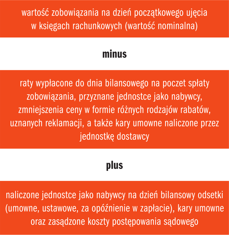 W myśl art. 28 ust. 1 pkt 8 ustawy o rachunkowości zobowiązania z tytułu dostaw i usług na dzień bilansowy wycenia się w wysokości wymagającej zapłaty. Oznacza to, że wycena zobowiązań powinna obejmować również ewentualne odsetki z tytułu opóźnienia w płatności, jeżeli jednostka jako nabywca została obciążona tymi odsetkami przez wierzyciela (na podstawie art. 481 § 1 Kodeksu cywilnego) lub naliczyła je sama na podstawie umowy oraz zasady memoriału, niezależnie od tego, czy zapłata miała miejsce. Kwota wymagająca zapłaty została określona w stanowisku Komitetu Standardów Rachunkowości dotyczącym rozrachunków z kontrahentami. Z treści tego stanowiska wynika, że kwota wymagająca zapłaty na dzień bilansowy to wartość zobowiązania ustalona na ten dzień, uwzględniająca: