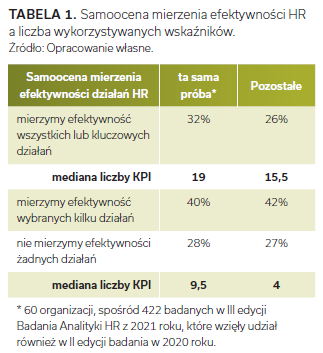 Co ciekawe, firmy te wypadają również lepiej w samoocenie mierzenia efektywności swoich działań HR-owych – 32% z nich mierzy wszystkie lub kluczowe działania, podczas gdy w pozostałych firmach robi to 26% respondentów. Warto także zwrócić uwagę na firmy, które uważają, że nie mierzą efektywności żadnych działań HR-owych. Wbrew pozorom wcale nie są to organizacje, które nie korzystają z żadnych wskaźników – przeciętne organizacje udzielające tej odpowiedzi korzystają z 4 KPI, a uczestnicy dwóch ostatnich edycji badania – korzystają przeciętnie niemal z 10 wskaźników. A co z respondentami, którzy uważają, że ich organizacje mierzą kluczowe lub wręcz wszystkie działania HR-owe? W liczbie mierzonych wskaźników HR-owych widać duży postęp – przeciętnie badane firmy, które wskazywały taką odpowiedź w samoocenie mierzą 16 wskaźników, ale firmy uczestniczące również w II edycji badania – korzystają przeciętnie z aż 19 KPI w HR (Tabela 1).